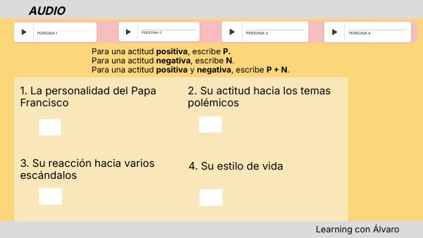 Para una actitud positiva, escribe P. Para una actitud negativa, escribe N. Para una actitud positiva y negativa, escribe P + N.