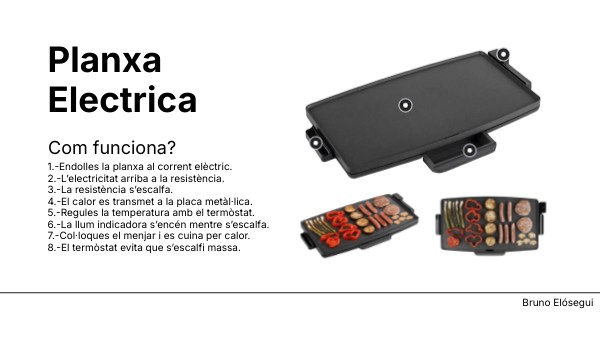 1.-Endolles la planxa al corrent elèctric. 2.-L’electricitat arriba a la resistència. 3.-La resistència s’escalfa. 4.-El calor es transmet a la placa metàl·lica. 5.-Regules la temperatura amb el termòstat. 6.-La llum indicadora s’encén mentre s’escalfa. 7.-Col·loques el menjar i es cuina per calor. 8.-El termòstat evita que s’escalfi massa.