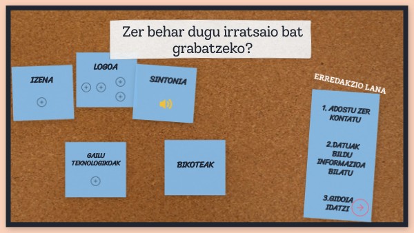 Irratsaioan zer egingo dugun erabaki ondoren aurrera eramateko egin behar diren lanak zerrendatu, partaideen artean ardurak banatu eta bakoitzak bere zatia prestatu dezan epeak markatu behar dira. Lana antolatua izatea komeni zaigu irratsaioa ondo atera dadin.
