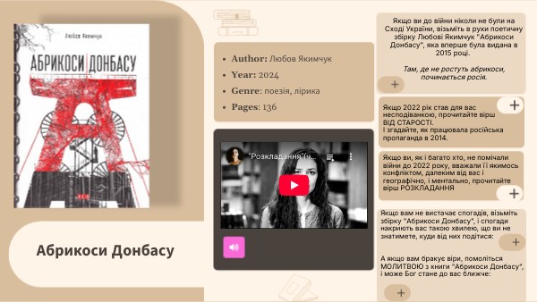 Якщо вам не вистачає спогадів, візьміть збірку "Абрикоси Донбасу", і спогади накриють вас такою хвилею, що ви не знатимете, куди від них подітися: А якщо вам бракує віри, помоліться МОЛИТВОЮ з книги "Абрикоси Донбасу", і може Бог стане до вас ближче: