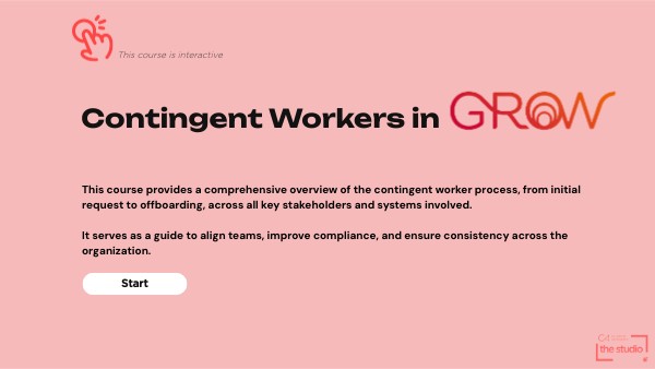 This course provides a comprehensive overview of the contingent worker process, from initial request to offboarding, across all key stakeholders and systems involved. It serves as a guide to align teams, improve compliance, and ensure consistency across the organization.
