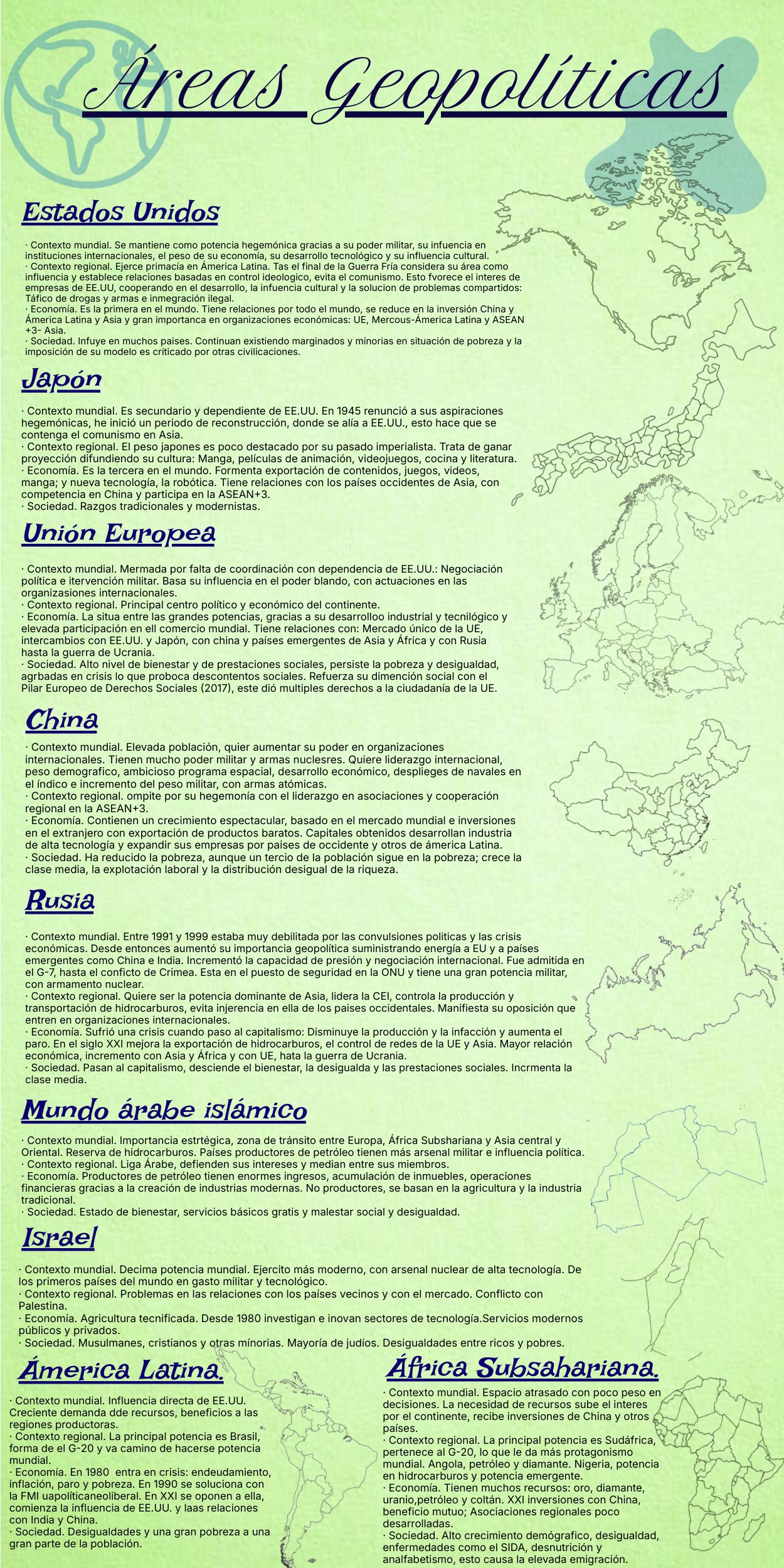 · Contexto mundial. Espacio atrasado con poco peso en decisiones. La necesidad de recursos sube el interes por el continente, recibe inversiones de China y otros países.· Contexto regional. La principal potencia es Sudáfrica, pertenece al G-20, lo que le da más protagonismo mundial. Angola, petróleo y diamante. Nigeria, potencia en hidrocarburos y potencia emergente. · Economía. Tienen muchos recursos: oro, diamante, uranio,petróleo y coltán. XXI inversiones con China, beneficio mutuo; Asociaciones regionales poco desarrolladas. · Sociedad. Alto crecimiento demógrafico, desigualdad, enfermedades como el SIDA, desnutrición y analfabetismo, esto causa la elevada emigración.