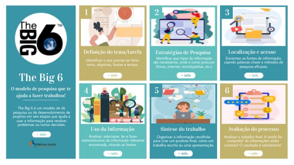 The Big 6 é um modelo de de pesquisa ou de desenvolvimento de projetos em seis etapas que ajuda a usar a informação para resolver problemas ou tomar decisões.
