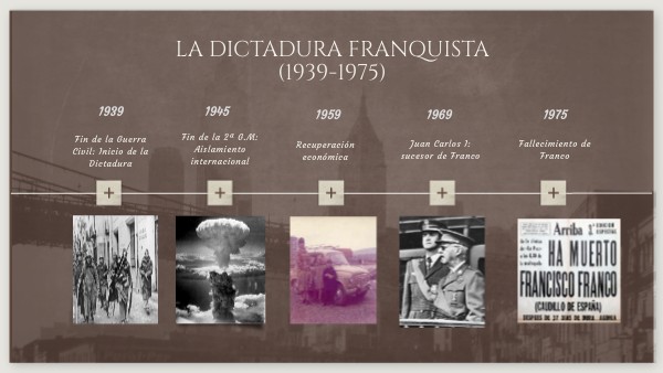 FOTO 1º.- SOLDADOS FIN DE LA GUERRA CIVIL Autor desconocido, Dominio público, via Wikimedia Commons https://commons.wikimedia.org/wiki/File:Soldrepteruel1937.jpg FOTO 2º. ULTIMO PARTE DE GUERRA DE FRANCO. Francisco Franco, Public domain, via Wikimedia Commons https://commons.wikimedia.org/wiki/File:Spain_final-guerra-civil.jpg FOTO 3º: BOMBARDEO ATÓMICO. Charles Levy, Public domain, via Wikimedia Commons https://commons.wikimedia.org/wiki/File:Nagasakibomb.jpg FOTO 4º. POLÍTICA EXTERIOR DE FRANCO. Bundesarchiv, Bild 183-L15327 / CC-BY-SA 3.0, CC BY-SA 3.0 DE <https://creativecommons.org/licenses/by-sa/3.0/de/deed.en>, via Wikimedia Commons https://commons.wikimedia.org/wiki/File:Bundesarchiv_Bild_183-L15327,_Spanien,_Heinrich_Himmler_bei_Franco.jpg FOTO 5º: SEAT 600 COMO IMAGEN DEL DESARROLLISMO. Donostia Kultura, CC BY-SA 2.0, via Wikimedia Commons https://commons.wikimedia.org/wiki/File:Amara_lumbreras_santos_donotia_01.jpg FOTO 6º: PLAYA DE TOSA DE MAR EN 1974. DagafeSQV, CC BY-SA 3.0 <https://creativecommons.org/licenses/by-sa/3.0>, via Wikimedia Commons https://commons.wikimedia.org/wiki/File:Platja_Gran_(Tossa_de_Mar)_any_1974.jpg FOTO 7º: FRANCO Y JUAN CARLOS. Anefo, CC0, via Wikimedia Commons https://commons.wikimedia.org/wiki/File:Franco_en_Juan_Carlos,_Bestanddeelnr_928-2237.jpg FOTO 8ª: FRANCO Y JUAN CARLOS (A COLOR) Anefo, CC0, via Wikimedia Commons https://commons.wikimedia.org/wiki/File:Generaal_Franco_(rechts)_en_Prins_Juan_Carlos,_Bestanddeelnr_254-9762.jpg FOTO 9ª: PERIÓDICO MUERTE FRANCO. Arriba, Public domain, via Wikimedia Commons https://commons.wikimedia.org/wiki/File:Portada_de_Arriba,_20_de_noviembre_de_1975.png FOTO 10º. TUMBA FRANCO VALLE DE LOS CAÍDOS Xauxa Håkan Svensson, CC BY-SA 3.0 <https://creativecommons.org/licenses/by-sa/3.0>, via Wikimedia Commons https://commons.wikimedia.org/wiki/File:ValleDeLosCaidos_Tomb_Franco.jpg