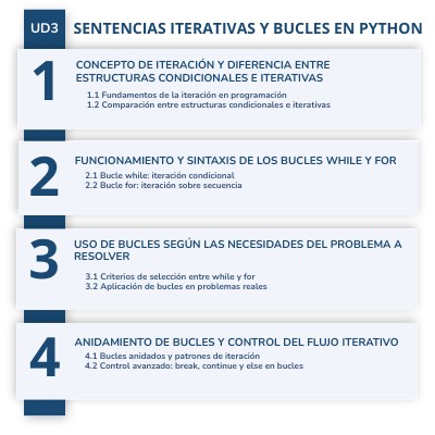 2.1 Bucle while: iteración condicional 2.2 Bucle for: iteración sobre secuencia