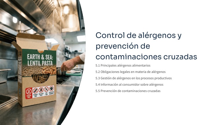 5.1 Principales alérgenos alimentarios 5.2 Obligaciones legales en materia de alérgenos 5.3 Gestión de alérgenos en los procesos productivos 5.4 Información al consumidor sobre alérgenos 5.5 Prevención de contaminaciones cruzadas