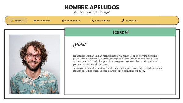 Mi nombre Cristian Fabian Mendoza Becerra, tengo 33 años, soy una persona polivalente, responsable, puntual, trabajo en equipo, me gusta adquirir nuevos conociminetos. En mis tiempos libres me gusta leer, escuchar musica, escuchar podcast de crecimiento personal. Tengo conocimientos de atencion al cliente, asesoria comercial, mozo de almacen, manejo de (Office Word, Execel, PowerPoint) y carnet de conducir.