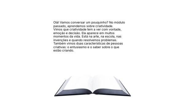 Olá! Vamos conversar um pouquinho? No módulo passado, aprendemos sobre criatividade. Vimos que criatividade tem a ver com vontade, emoção e decisão. Ela aparece em muitos momentos da vida. Está na arte, na escola, nas invenções e quando resolvemos problemas. Também vimos duas características de pessoas criativas: o entusiasmo e o saber sobre o que estão criando.