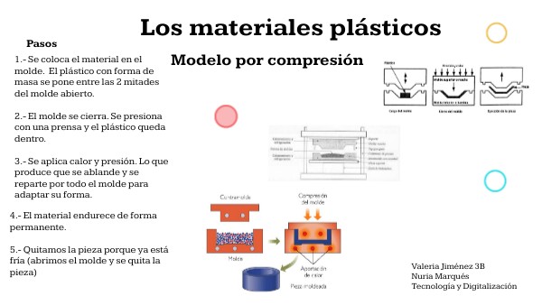 1.- Se coloca el material en el molde. El plástico con forma de masa se pone entre las 2 mitades del molde abierto. 2.- El molde se cierra. Se presiona con una prensa y el plástico queda dentro. 3.- Se aplica calor y presión. Lo que produce que se ablande y se reparte por todo el molde para adaptar su forma.