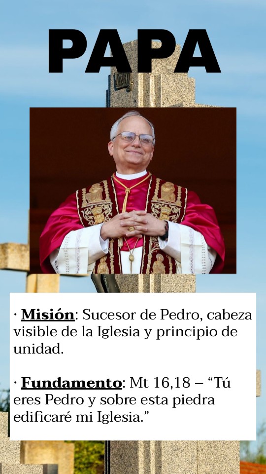 · Misión: Sucesor de Pedro, cabeza visible de la Iglesia y principio de unidad. · Fundamento: Mt 16,18 – “Tú eres Pedro y sobre esta piedra edificaré mi Iglesia.”