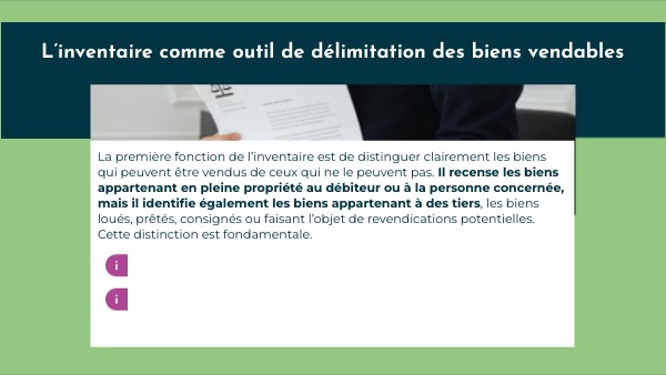 La première fonction de l’inventaire est de distinguer clairement les biens qui peuvent être vendus de ceux qui ne le peuvent pas. Il recense les biens appartenant en pleine propriété au débiteur ou à la personne concernée, mais il identifie également les biens appartenant à des tiers, les biens loués, prêtés, consignés ou faisant l’objet de revendications potentielles. Cette distinction est fondamentale.