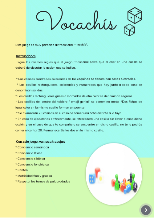 Este juego es muy parecido al tradicional "Parchís". Instrucciones: Sigue las mismas reglas que el juego tradicional salvo que al caer en una casilla se deberá de ejecutar la acción que se indica. * Las casillas cuadradas coloreadas de las esquinas se denominan casas o cárceles. * Las casillas rectangulares, coloreadas y numeradas que hay junto a cada casa se denominan salidas. * Las casillas rectangulares grises o marcadas de otro color se denominan seguros. * Las casillas del centro del tablero " emoji genial" se denomina meta. *Dos fichas de igual color en la misma casilla forman un puente * Se avanzarán 20 casillas en el caso de comer una ficha distinta a la tuya * En caso de ejecutarlas erróneamente, se retrocederá una casilla sin llevar a cabo dicha acción y en el caso de que tu compañero se encuentre en dicha casilla, no te lo podrás comer ni contar 20. Permaneceréis los dos en la misma casilla. Con este juego, vamos a trabajar: * Conciencia semántica * Conciencia léxica * Conciencia silábica * Conciencia fonológica * Conteo * Motricidad fina y gruesa * Respetar los turnos de palabradados