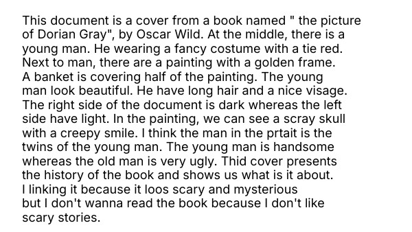 This document is a cover from a book named " the pictureof Dorian Gray", by Oscar Wild. At the middle, there is a young man. He wearing a fancy costume with a tie red.Next to man, there are a painting with a golden frame.A banket is covering half of the painting. The young man look beautiful. He have long hair and a nice visage.The right side of the document is dark whereas the left side have light. In the painting, we can see a scray skull with a creepy smile. I think the man in the prtait is the twins of the young man. The young man is handsome whereas the old man is very ugly. Thid cover presentsthe history of the book and shows us what is it about.I linking it because it loos scary and mysteriousbut I don't wanna read the book because I don't like scary stories.