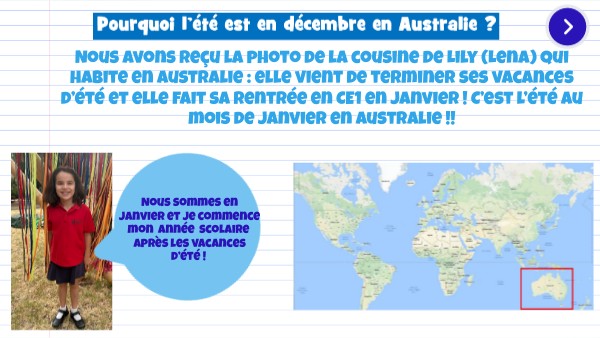 Nous avons reçu la photo de la cousine de Lily (Lena) qui habite en Australie : elle vient de terminer ses vacances d’été et elle fait sa rentrée en CE1 en janvier ! C’est l’été au mois de janvier en Australie !!