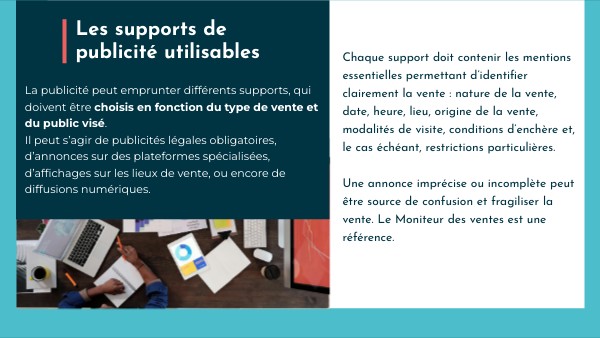 La publicité peut emprunter différents supports, qui doivent être choisis en fonction du type de vente et du public visé. Il peut s’agir de publicités légales obligatoires, d’annonces sur des plateformes spécialisées, d’affichages sur les lieux de vente, ou encore de diffusions numériques.