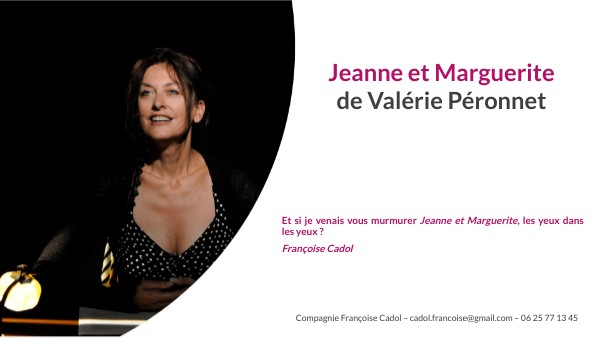 « Françoise Cadol, seule en scène, délivre une interprétation d’une vérité et d‘une sincérité désarmantes. R.Dhéry – Un fauteuil pour l’orchestre « Françoise Cadol interprète magnifiquement Jeanne et Marguerite. Lumineuse, délicate, sensible, elle bascule sans cesse d’une femme à l’autre avec virtuosité et légèreté. » P. Lacan Martin – Reg’Arts « Une pièce délicate et intemporelle. C’est avec authenticité et justesse que Françoise Cadol s’empare du très beau texte de Valérie Péronnet. » F.Gopikian Yeremian – BSC news « Dans une interprétation à fleur de peau, la superbe Françoise Cadol donne vie au texte poignant et drôle à la fois de Valérie Péronnet que met en scène avec beaucoup de délicatesse Christophe Luthringer. Une très belle page d’amour... » F.Bortelle – artistik rezo