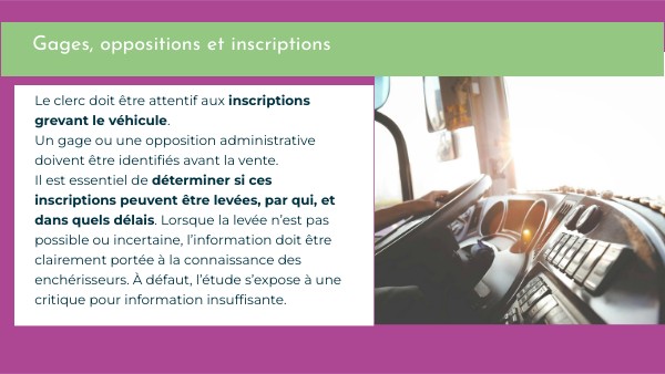 Le clerc doit être attentif aux inscriptions grevant le véhicule. Un gage ou une opposition administrative doivent être identifiés avant la vente. Il est essentiel de déterminer si ces inscriptions peuvent être levées, par qui, et dans quels délais. Lorsque la levée n’est pas possible ou incertaine, l’information doit être clairement portée à la connaissance des enchérisseurs. À défaut, l’étude s’expose à une critique pour information insuffisante.