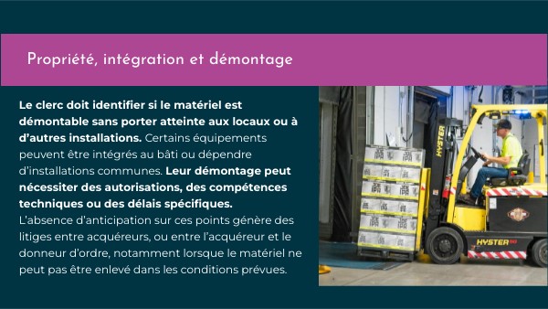 Le clerc doit identifier si le matériel est démontable sans porter atteinte aux locaux ou à d’autres installations. Certains équipements peuvent être intégrés au bâti ou dépendre d’installations communes. Leur démontage peut nécessiter des autorisations, des compétences techniques ou des délais spécifiques. L’absence d’anticipation sur ces points génère des litiges entre acquéreurs, ou entre l’acquéreur et le donneur d’ordre, notamment lorsque le matériel ne peut pas être enlevé dans les conditions prévues.