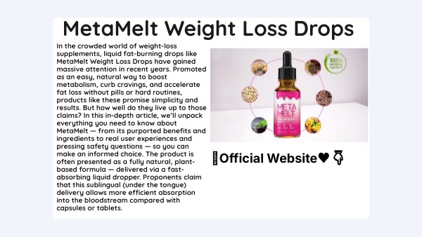 In the crowded world of weight-loss supplements, liquid fat-burning drops like MetaMelt Weight Loss Drops have gained massive attention in recent years. Promoted as an easy, natural way to boost metabolism, curb cravings, and accelerate fat loss without pills or hard routines, products like these promise simplicity and results. But how well do they live up to those claims? In this in-depth article, we’ll unpack everything you need to know about MetaMelt — from its purported benefits and ingredients to real user experiences and pressing safety questions — so you can make an informed choice. The product is often presented as a fully natural, plant-based formula — delivered via a fast-absorbing liquid dropper. Proponents claim that this sublingual (under the tongue) delivery allows more efficient absorption into the bloodstream compared with capsules or tablets.