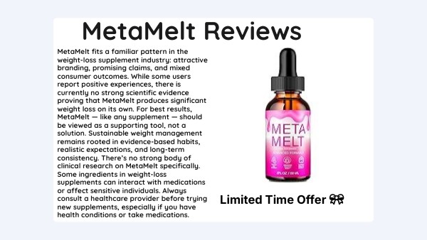 MetaMelt fits a familiar pattern in the weight-loss supplement industry: attractive branding, promising claims, and mixed consumer outcomes. While some users report positive experiences, there is currently no strong scientific evidence proving that MetaMelt produces significant weight loss on its own. For best results, MetaMelt — like any supplement — should be viewed as a supporting tool, not a solution. Sustainable weight management remains rooted in evidence-based habits, realistic expectations, and long-term consistency. There’s no strong body of clinical research on MetaMelt specifically. Some ingredients in weight-loss supplements can interact with medications or affect sensitive individuals. Always consult a healthcare provider before trying new supplements, especially if you have health conditions or take medications.