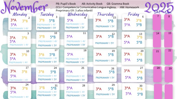 PB: Pupil's Book AB: Activity Book GB: Gramma Book CCLI: Competencia Comunicativa Lengua Inglesa. HW: Homework Preprimary I3Y: 3 años infantil