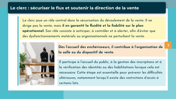 Le clerc joue un rôle central dans la sécurisation du déroulement de la vente. Il ne dirige pas la vente, mais il en garantit la fluidité et la fiabilité sur le plan opérationnel. Son rôle consiste à anticiper, à contrôler et à alerter, afin d’éviter que des dysfonctionnements matériels ou organisationnels ne perturbent la vente.