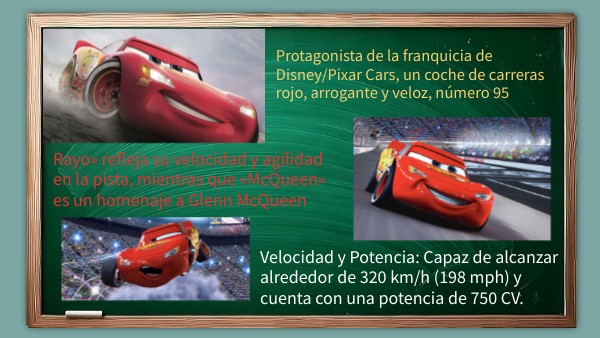 Rayo» refleja su velocidad y agilidad en la pista, mientras que «McQueen» es un homenaje a Glenn McQueen