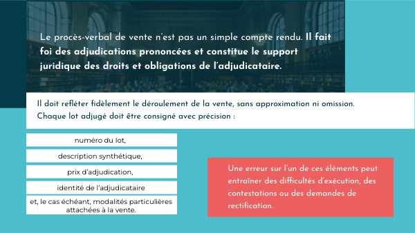 Il doit refléter fidèlement le déroulement de la vente, sans approximation ni omission. Chaque lot adjugé doit être consigné avec précision :