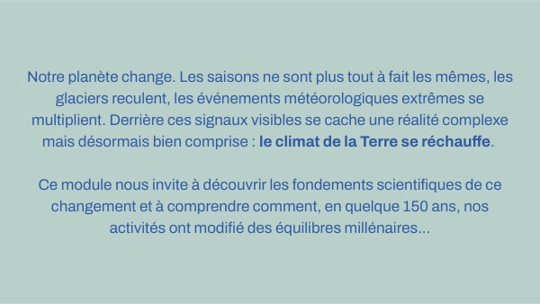 Notre planète change. Les saisons ne sont plus tout à fait les mêmes, les glaciers reculent, les événements météorologiques extrêmes se multiplient. Derrière ces signaux visibles se cache une réalité complexe mais désormais bien comprise : le climat de la Terre se réchauffe. Ce module nous invite à découvrir les fondements scientifiques de ce changement et à comprendre comment, en quelque 150 ans, nos activités ont modifié des équilibres millénaires...