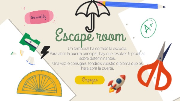 Un temporal ha cerrado la escuela. Para abrir la puerta principal, hay que resolver 6 pruebas sobre determinantes. Una vez lo consigáis, tendréis vuestro diploma que os hará abrir la puerta.