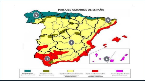Zonas alejadas del mar, con clima seco, lluvias escasas y fuertes contrastes de temperatura, lo que condiciona la agricultura.Características: