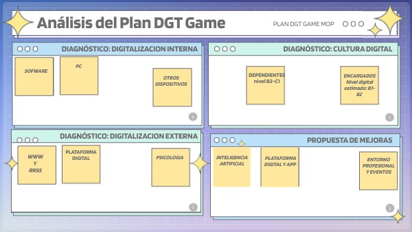 Diagnóstico de digitalización interna GAME cuenta con una infraestructura tecnológica adecuada y moderna, que incluye ordenadores de alto rendimiento, sistemas ERP, CRM, TPV y diversas herramientas en la nube que facilitan la gestión y operación del negocio. Los empleados utilizan tablets, escáneres y sistemas de inventario digitalizados que mejoran la eficiencia en sus tareas diarias. No obstante, aún existe un potencial significativo para avanzar en áreas como la analítica avanzada, la inteligencia artificial y la automatización de procesos, lo cual permitiría optimizar aún más la gestión de inventarios, las ventas y la logística, logrando una mayor eficiencia y competitividad en el mercado.