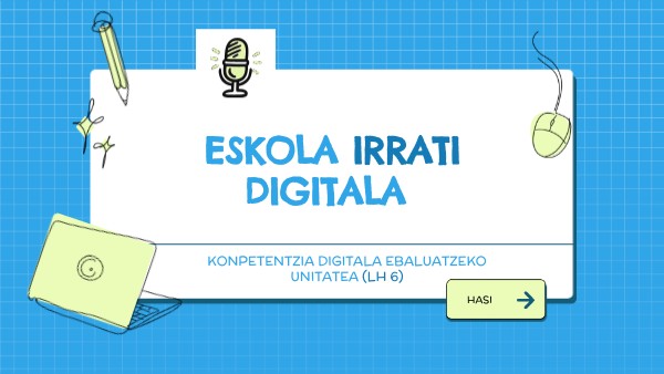 Gure ikastetxeak online eskola-irrati bat jarriko du abian, eta ikasleak arduratuko zarete intereseko gaiei buruzko irratsaioak grabatu, editatu eta argitaratzeaz: ingurumena, bizikidetza, tokiko kultura eta eskolako albisteak. Zuzendaritza-taldeak tresna digitalak erabiliz lehen programa pilotua diseinatzeko eta ekoizteko eskatu dizue 6. mailako ikasleei.