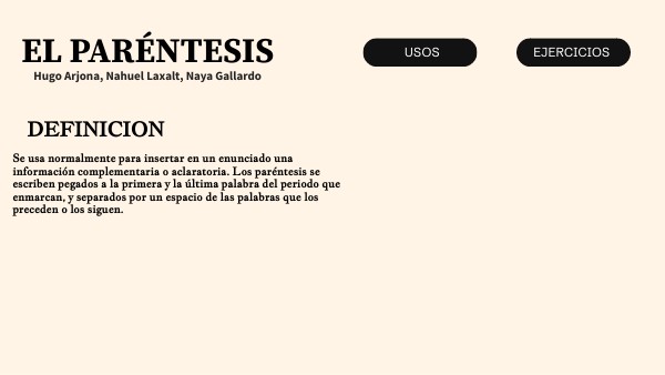 Se usa normalmente para insertar en un enunciado una información complementaria o aclaratoria. Los paréntesis se escriben pegados a la primera y la última palabra del periodo que enmarcan, y separados por un espacio de las palabras que los preceden o los siguen.