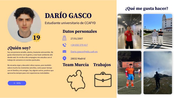 Soy una persona amable, atenta y bastante extrovertida. Me gusta relacionarme con la gente y crear buen ambiente allá donde esté. En mi día a día compagino mis estudios con el trabajo de camarero en eventos puntuales.Me encanta viajar y descubrir sitios nuevos, pero también valoro mucho los momentos sencillos, como pasar tiempo con mi familia y mis amigos. Soy alguien activo, positivo que aprovecha siempre para vivir experiencias inolvidables