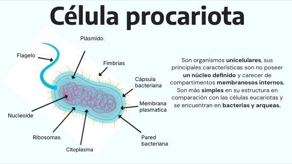 Son organismos unicelulares, sus principales características son no poseer un núcleo definido y carecer de compartimentos membranosos internos. Son más simples en su estructura en comparación con las células eucariotas y se encuentran en bacterias y arqueas.