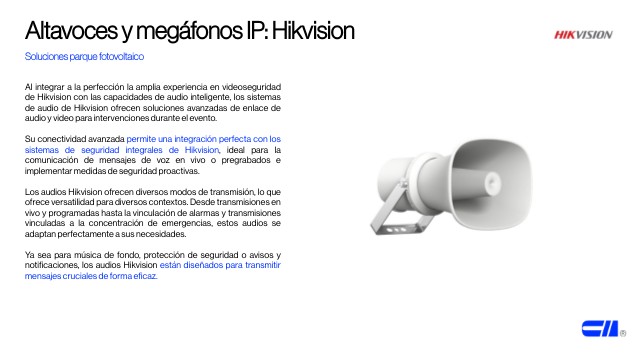 Al integrar a la perfección la amplia experiencia en videoseguridad de Hikvision con las capacidades de audio inteligente, los sistemas de audio de Hikvision ofrecen soluciones avanzadas de enlace de audio y video para intervenciones durante el evento. Su conectividad avanzada permite una integración perfecta con los sistemas de seguridad integrales de Hikvision, ideal para la comunicación de mensajes de voz en vivo o pregrabados e implementar medidas de seguridad proactivas. Los audios Hikvision ofrecen diversos modos de transmisión, lo que ofrece versatilidad para diversos contextos. Desde transmisiones en vivo y programadas hasta la vinculación de alarmas y transmisiones vinculadas a la concentración de emergencias, estos audios se adaptan perfectamente a sus necesidades. Ya sea para música de fondo, protección de seguridad o avisos y notificaciones, los audios Hikvision están diseñados para transmitir mensajes cruciales de forma eficaz.