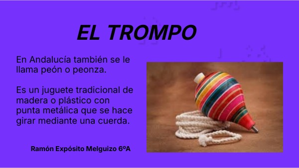 En Andalucía también se le llama peón o peonza. Es un juguete tradicional de madera o plástico con punta metálica que se hace girar mediante una cuerda.