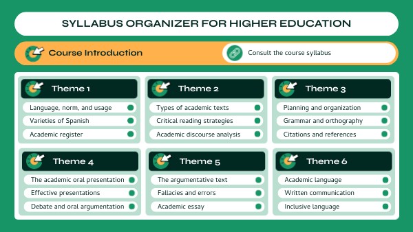 Visually and practically organize the syllabus for your university courses with this free template. Ideal for teachers and students. Customize the content and keep everything under control.