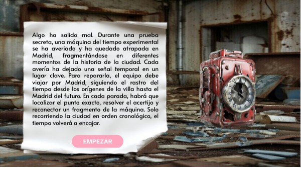 Algo ha salido mal. Durante una prueba secreta, una máquina del tiempo experimental se ha averiado y ha quedado atrapada en Madrid, fragmentándose en diferentes momentos de la historia de la ciudad. Cada avería ha dejado una señal temporal en un lugar clave. Para repararla, el equipo debe viajar por Madrid, siguiendo el rastro del tiempo desde los orígenes de la villa hasta el Madrid del futuro. En cada parada, habrá que localizar el punto exacto, resolver el acertijo y reconectar un fragmento de la máquina. Solo recorriendo la ciudad en orden cronológico, el tiempo volverá a encajar.