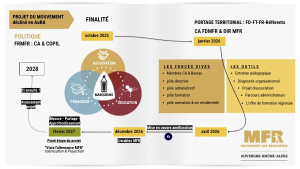 L'équipe projet est composée des directions des fédérations, Alexandre VA, Sonia G, Équipe FR et référents pédagogiques désignés : - Réunions de travail : définir et/ou corriger les objectifs - Architectes d'avenir : initier des synergies entres les parties prenantes du projets, notamment les membres des conseils d'administration et des équipes des MFR