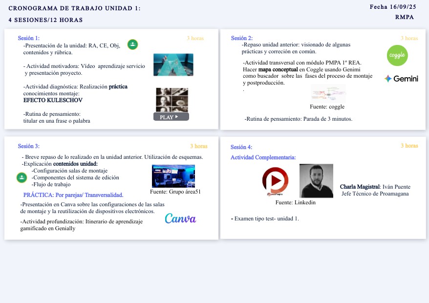 -Presentación de la unidad: RA, CE, Obj, contenidos y rúbrica. - Actividad motivadora: Vídeo aprendizaje servicio y presentación proyecto. -Actividad diagnóstica: Realización práctica conocimientos montaje: EFECTO KULESCHOV -Rutina de pensamiento: titular en una frase o palabra
