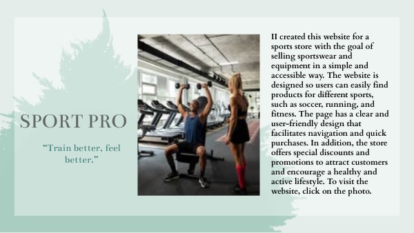 II created this website for a sports store with the goal of selling sportswear and equipment in a simple and accessible way. The website is designed so users can easily find products for different sports, such as soccer, running, and fitness. The page has a clear and user-friendly design that facilitates navigation and quick purchases. In addition, the store offers special discounts and promotions to attract customers and encourage a healthy and active lifestyle. To visit the website, click on the photo.