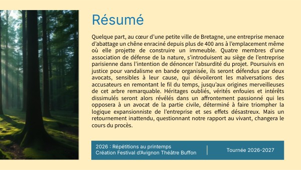 Comment préserver le fragile équilibre qui nous permet de respirer ? Réveillant les voix du passé et confrontant le conte au réel, ces trois avocats s’affrontent à propos d’un arbre dont l’avenir incertain figure, à lui seul, celui des forêts du monde entier. Inspirée de faits réels, cette « Plaidoirie des Forêts », nous entraîne au cœur d’un procès qui soulève des questions essentielles, plaçant l’humanité face à elle-même et aux conditions de sa survie, indissociables de sa relation à la nature. Parce que le théâtre porte originellement en lui la vocation d’interroger les vivants, nous aurons à cœur de le changer en clairière, un lieu singulier reliant l’intime au collectif, l’écologie à la mémoire et le sensible au politique. Convoquée sur scène, la forêt elle-même semblera alors prendre la parole et faire entrer sa poésie au tribunal, révélant nos responsabilités et éclairant le chemin à suivre. Le monde des tribunaux et la rigueur de son langage sera donc traversé par celui des contes et son imagerie des émotions. C’est de cette alternance formelle, entre réalisme factuel et évocation symbolique, de cette rencontre entre deux univers dont les codes nous semblent s’opposer, que peut apparaitre le théâtre, avec ses questionnements fondamentaux et sa poésie élémentaire.