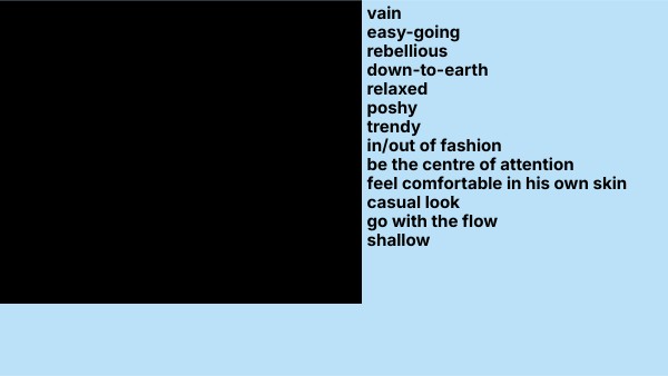 vain easy-going rebellious down-to-earth relaxed poshy trendy in/out of fashion be the centre of attention feel comfortable in his own skin