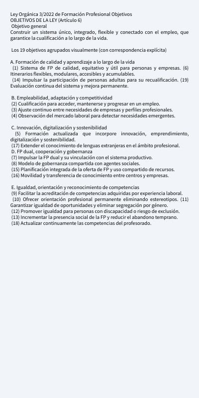 🎯 Objeto y finalidad: Constituir un sistema único e integrado de Formación Profesional que impulse la competitividad, sostenibilidad y flexibilidad de la economía, adaptando la cualificación de las personas a las nuevas demandas laborales y favoreciendo itinerarios formativos a lo largo de la vida.