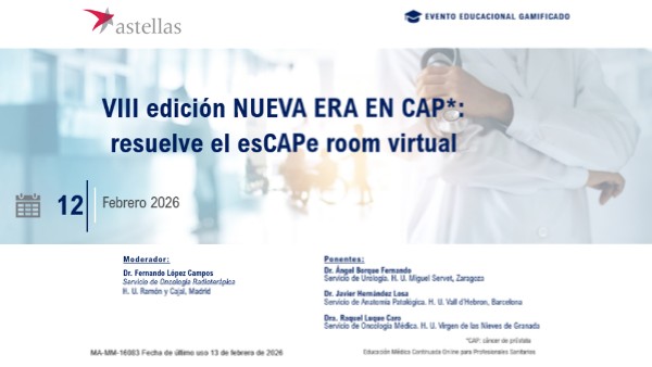 Los videos, audios, imágenes, resultados, conclusiones y opiniones presentados en este material tienen un fin exclusivamente informativo científico y/o formativo. Todo lo expuesto es responsabilidad exclusiva de los autores(as) que lo presentan. Todos los aspectos expuestos se han realizado teniendo en cuenta el conocimiento/ evidencia disponible en el momento de su creación y, por tanto, será necesario verificar su vigencia en el momento en que usted lo esté visualizando/ escuchando. Astellas está comprometida con la formación médica continuada dirigida a profesionales sanitarios y con este objetivo apoya la difusión de estos contenidos, si bien, está exenta de responsabilidad sobre los mismos.
