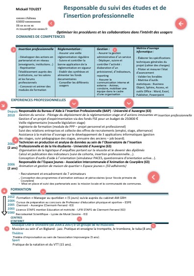 Responsable du Bureau d’Aide à l’Insertion Professionnelle (BAIP) - Université d’Auvergne (63) Gestion du service - Pilotage du déploiement de la réglementation stage et d’actions innovantes en Gestion d’un projet d'expérimentation via des fonds FSE pour un budget de 250000 € Veille règlementaire (nouvelle législation stage) Ingénierie de formation (module de PPP – projet personnel et professionnel) Suivi des relations entreprises et collecte des offres de recrutements (emploi, stage, alternance) Assistance à la maitrise d’ouvrage sur le développement de 3 applications informatiques (gestion des stages, suivi pédagogique des stages, annuaire des anciens – job board). Technicien en production et analyse de données au sein de l’Observatoire de l’Insertion Professionnelle et de la Vie étudiante - Université d’Auvergne (63) Organisation de la logistique d’enquêtes portant sur la réussite et le devenir des diplômés Calcul et publication des indicateurs (suivi de cohorte, insertion professionnelle…). Conception d'outils d'aide à l’orientation (simulateur PACES, questionnaire d'orientation active...). Responsable de l’Espace Jeunes - Association Intercommunale d’Animation de Courpière (63) Animation et gestion de maison de quartier « Espace jeunes » (50 adhérents)