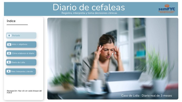 Lidia, de 37 años de edad, casada y madre de dos hijos, trabaja en una empresa de publicidad. Acude a nuestra consulta de medicina de familia de un centro de salud semiurbano por cefalea intensa de mucho tiempo de evolución, “de toda la vida”. Nos demanda una solución para poder llevar a cabo una vida normal tanto en su vida personal como profesional.