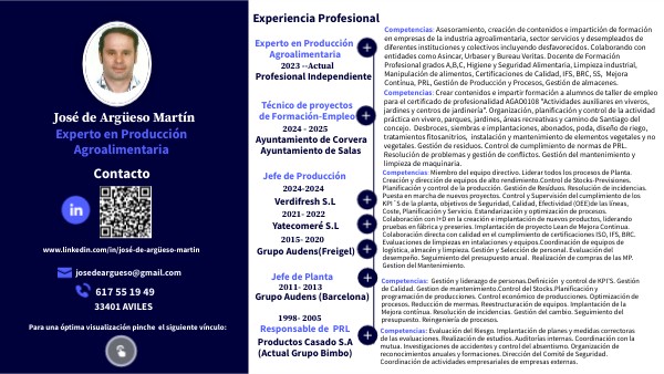 Competencias: Asesoramiento, creación de contenidos e impartición de formación en empresas de la industria agroalimentaria, sector servicios y desempleados de diferentes instituciones y colectivos incluyendo desfavorecidos. Colaborando con entidades como Asincar, Urbaser y Bureau Veritas. Docente de Formación Profesional grados A,B,C, Higiene y Seguridad Alimentaria, Limpieza industrial, Manipulación de alimentos, Certificaciones de Calidad, IFS, BRC, 5S, Mejora Contínua, PRL, Gestión de Producción y Procesos, Gestión de almacenes.